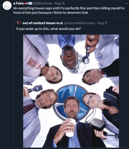 Absolutely. A continuing theme in the show that is consistently overlooked by a lot of people is that his primary addiction isn’t vicodin. It’s solving a puzzle. Like they bat people upside the head with that over so many major plot points and so many people I know who watched it just didn’t get that. Fucking Cuddy even says it point blank in one episode. Nope.