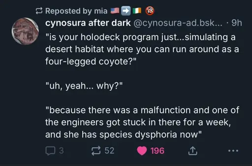arrow-up1284arrow-down1imageholodeck rulelemmy.blahaj.zoneNorah (pup/it/she)@lemmy.blahaj.zone to 196@lemmy.blahaj.zoneEnglish · 5 months agomessage-square18linkfedilink