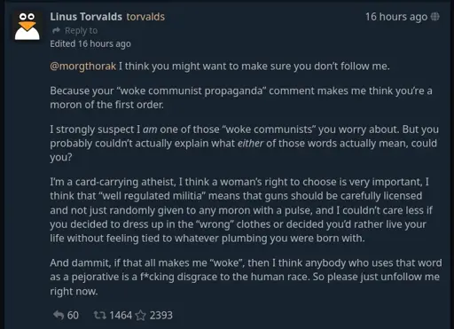 Torvalds’ particular brand of constructive criticism tends to be insulting and demeaning rather than simply “direct”. We can acknowledge that without deflecting to worse people.