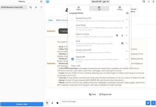 Newelle supports interfacing with the Google Gemini API, the OpenAI API, Groq, and also local large language models (LLMs) or ollama instances for powering this AI assistant.