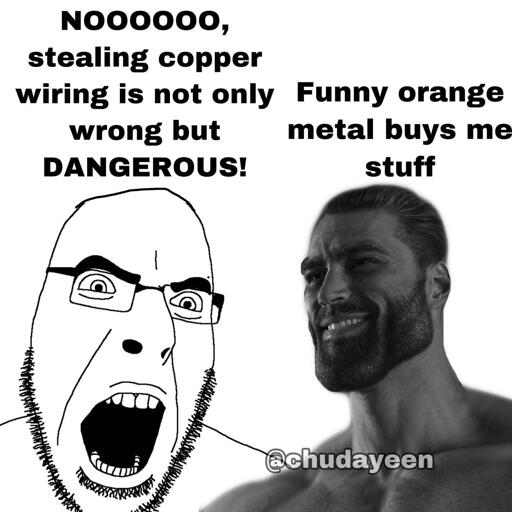 also I like to sarcastically promote copper stealing anytime the topic comes up by just sending wojack memes that have the copper hater as the sad small wojack and the copper stealer as the big chad wojack