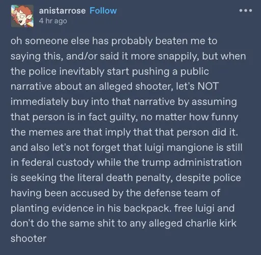 Yup. Luigi is likely yet another innocent victim of cruel billionaires, so I no longer feel comfortable talking about pulling a Luigi on capitalists. Terrorizing billionaires with targeted assassinations however…