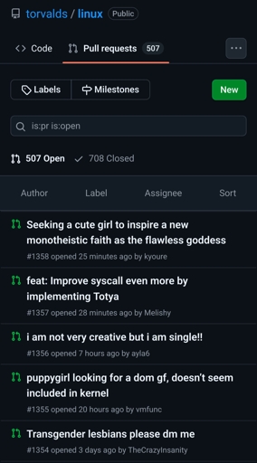 yogurtwrong@lemmy.world to Linux@lemmy.ml · 2 months agoLinux github repo is now a dating boardlemmy.mlimagemessage-square55linkfedilinkarrow-up1374arrow-down18