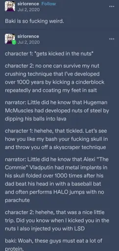 I still can’t get over how homoerotic it is. You’ll always get layers of that in anything that centres on hyper-masculine sports or fiction, but Baki is so heavy with it I can’t tell if it’s intentional as some kind of commentary or if the author is just a severely repressed gay guy.