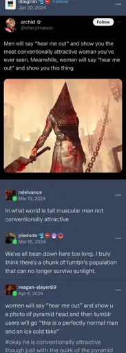 “hear me though” posts selectively pick some features of otherwise scary or weird people. Pyramid head is muscular, slender but not skinny and tall. If you ignore the blood he’s just an conventionally attractive person, some people are even into gore, you don’t even need to blank much.