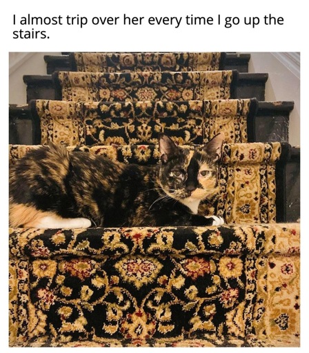 A picture of a tortoiseshell cat lying on a step of a staircase. The staircase is covered with carpet that matches the cat’s coat color, making the cat blend in completely. Caption reads “I almost trip over her every time I go up the stairs.”
