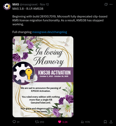 arrow-up1406arrow-down1imageMicrosoft has blocked Massgrave's KMS38 activation method for Windowslemmy.mlmr_MADAFAKA@lemmy.ml to Piracy: ꜱᴀɪʟ ᴛʜᴇ ʜɪɢʜ ꜱᴇᴀꜱ@lemmy.dbzer0.comEnglish · 1 month agomessage-square135linkfedilinkfile-text