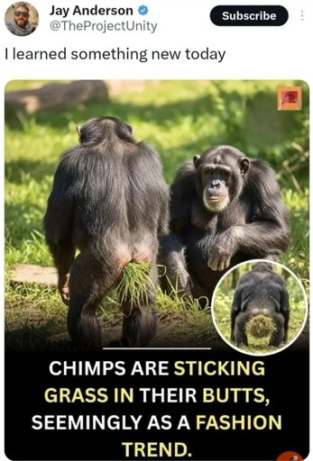 https://doi.org/10.1163/1568539X-bja10313 https://www.cbc.ca/radio/asithappens/chimpanzee-grass-butt-1.7583207#%3A~%3Atext=Chimpanzee+influencers%2Cthing+happened+to+Julie's+group. https://lemmy.ca/post/55415461