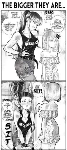 NSFWAlt text: a tall, long-haired gal with a Metallica shirt and ripped jeans/leggings. She pats a blonde short gal in a flower dress. She says: “Oh my god, you are so short! You must be really submissive, huh? Right, little bottom? Not me, though, I’m a lioness. My “top energy” makes girls meow like little kittens. And I-” and gets interrupted in the next panel by the short girl pointing to her saying: “Bad girl, sit!”.