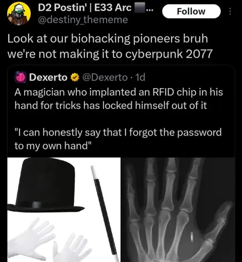 Hell, it could even check the public key of the RFID chip, so you’re still safe unless an audience member clones your hand chip and embeds it in their hand.