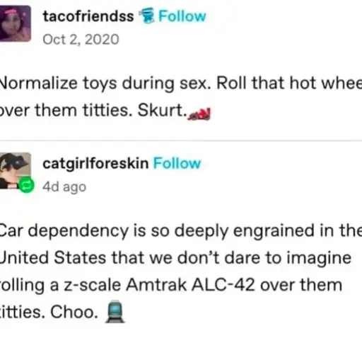 NSFWtranscription: tacofriendss: “normalize toys during sex. roll that hot wheel over them tittys, skurt” catgirlforeskin: “car dependency is do deeply ingrained in the united state that we dont dare to imagine rolling a z-scale amtrack alc-42 over them titties, choo”