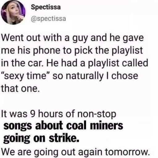 compostgoblin@piefed.blahaj.zone to 196@lemmy.blahaj.zoneEnglish · 19 days agoCoal miners going on rulepiefed.cdn.blahaj.zoneimagemessage-square54linkfedilinkarrow-up1943arrow-down19