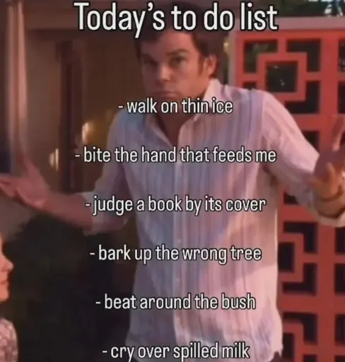 minus-squareRandelung@lemmy.worldlinkfedilinkEnglisharrow-up7·28 days ago burn some bridges then cross said bridges lead a horse to water, then force it to drink put toothpaste back into tube unshoot an arrow wear cape